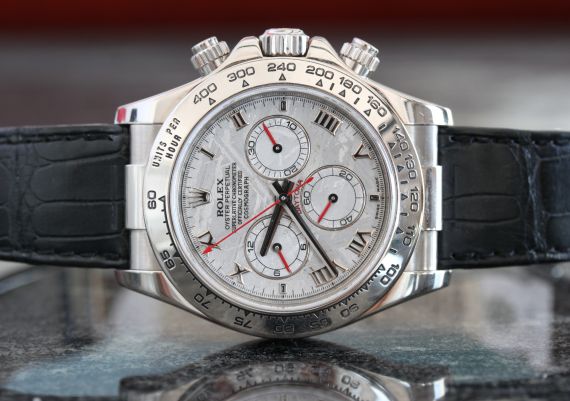 Rolex Daytona 116519 Meteorite White Gold Case: Light wear. Bracelet: Black Crocodile with light wear. Accessories: Box and Papers. New style card. Specifications: Brand: Rolex Style: Daytona Model: 116519 Serial: F Size: 40mm Material: White Gold